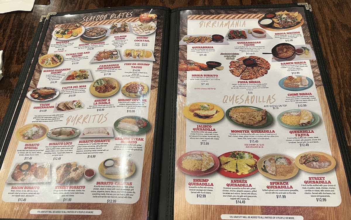 Start with the Southwest Salad, a refreshing mix of greens topped with grilled chicken, black beans, and roasted corn, finished with a creamy avocado ranch dressing. If you're in the mood for something hearty, the Andres Quesadilla is a must-try—an oversized delight stuffed with grilled chicken, chorizo, and jalapeños, accompanied by fresh guacamole and sour cream.